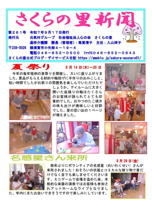 9月度広報誌を発行致しました 2025/08/27 衣笠山からの便り120号 さくらの里新聞261号 さくらの里味便り238号 さくらの家味便り156号 さくらの里山科新聞150号 さくらの里山科味便り156号 お知らせ一覧へ戻る